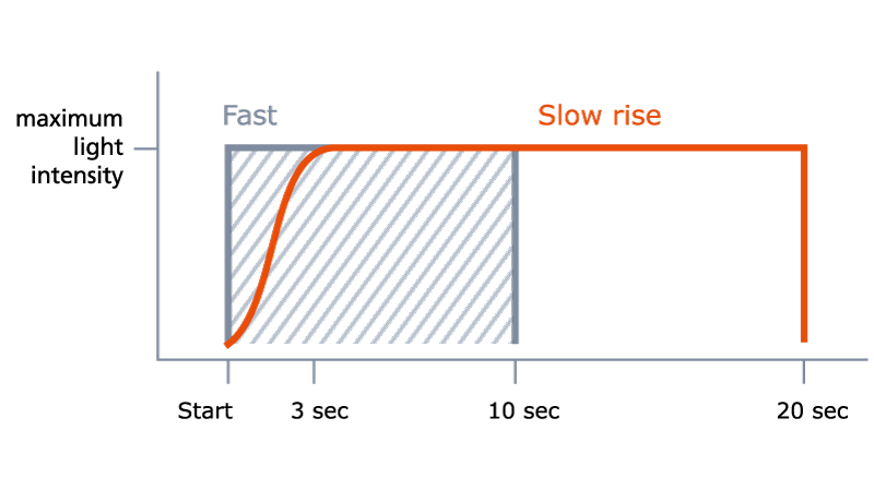 - Modo de “subida lenta”: 20 segundos con un aumento progresivo de la intensidad de la luz que alcanza el pico dentro de los primeros 3 segundos, una señal acústica después de 10 segundos y una al final del ciclo